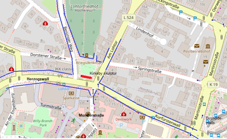 Münsterstraβe sydøst for det centrale rum fører til/fra den gamle bykerne. Når man kommer herfra dukker Recklinghausen pludseligt op som et stort værk 30-40 meter før krydset ved Am Lohtor, foto 8. Der er en stor kontrast fra snævre og skæve gågader til skulpturens rum med træer, grønt og gader med biltrafik. På hjørnet ligger en femetages høj markant ældre ejendom med udsmykket facade.