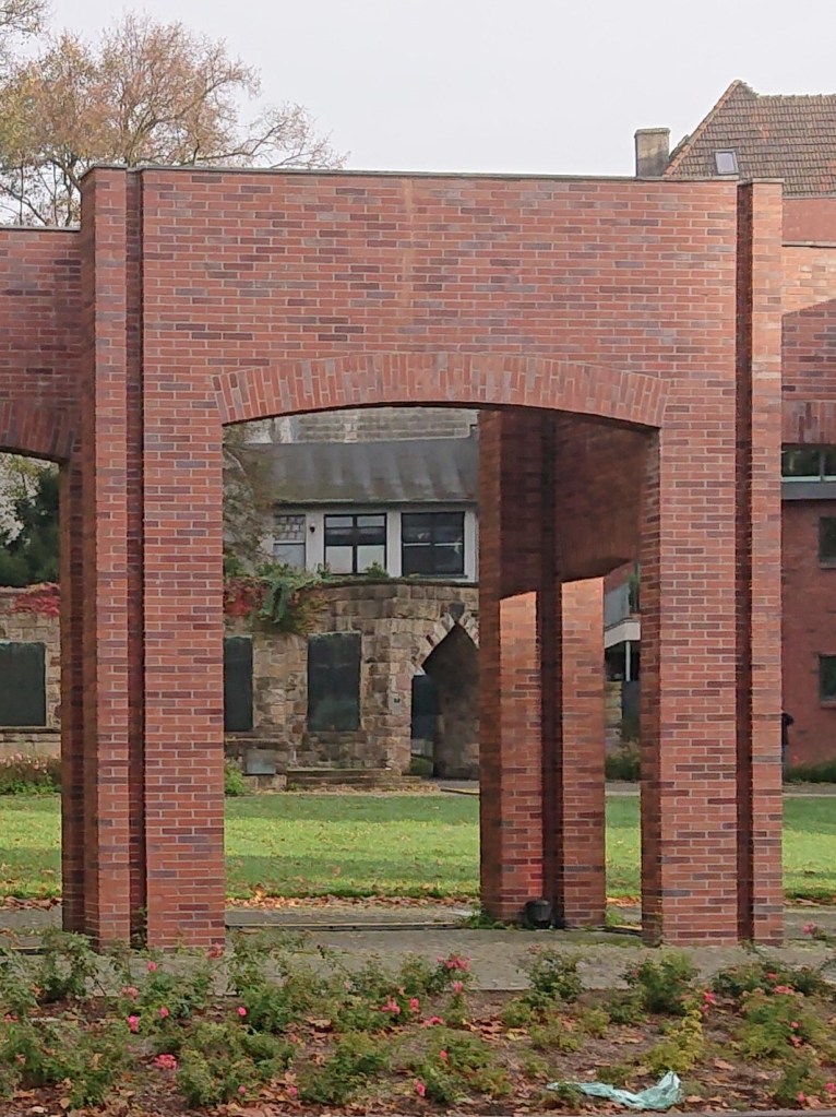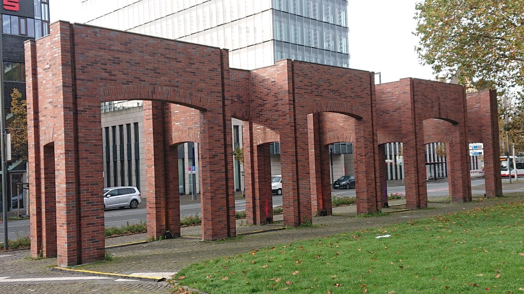 I find Recklinghausen to be a successful and aesthetic solution to the spatial function of the area. In addition, the work creates associations in several ways. Apart from the thoughts that one might associate with a city wall, the large gates allow one to perceive the work as a lens through which one can see the world from two sides. The passageway may bring to mind a corridor, a narrow strip of land/space through which one can pass freely. Or, with the meander as a starting point, a journey through the ups and downs of life on two levels. But the meander can also be seen as an obituary for the dead in the War Memorial. And many may see the work as a ruin from the war, and as a testimony to war as destruction and death rather than heroic deeds.