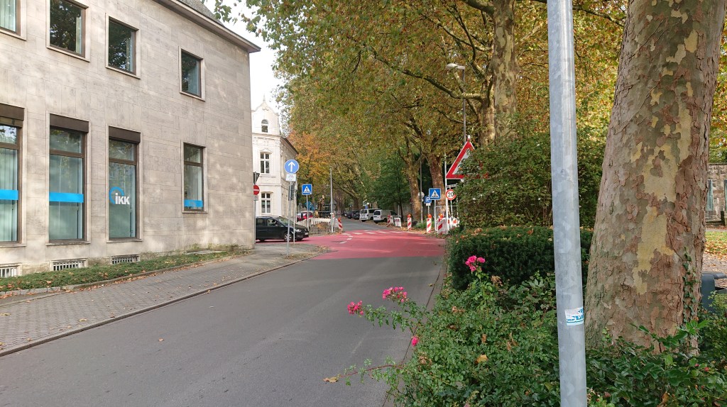Det lange gaderum i øst-vestlig retning udenfor det centrale rum dannes af Herzogswall og Kurfürstenwall. Fra den sidstnævnte gade kan man se Recklinghausen på omkring 300 meters afstand. På grund af gadens drejning og bygningerne langs gaden, kan man opleve det, som om værket står midt på gaden, når man kommer herfra. Værket står på en måde som i en slugt og som et endemål, foto 7. Men det kan også ses som en forlængelse af det ældre byggeri på højre side, Indsynet fra Herzogswall er kortere omkring 100 meter på grund af gadens drejning, her dukker værket mere pludseligt op. Gadernes byggeri er en blanding af nyere og ældre byggeri i røde sten eller pudsede mure.