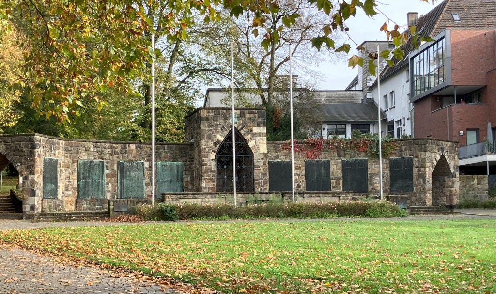 Granitblokkene sender et signal om klippe og noget, som er urokkeligt, blivende. I murens ender er der er porte med indgang til en park bagved, en tidligere kirkegård, og i midten et kapellignende rum med gitter foran og en indskrift med en dedikation til byens ’faldne sønner’ på bagmuren. ’Kapellet’ og portene har spidse buer. I den vestlige ende står et større krucifiks med den korsfæstede Jesus og Maria og Johannes ved siderne (ses ikke på foto 3). På murene er der anbragt otte store støbejernsplader med navne på 2260 faldne fra første verdenskrig samt nogle faldne i forbindelse med uroligheder i 1920 (Ruhropstanden) og 1923-24 (kampe mod Frankrig).
