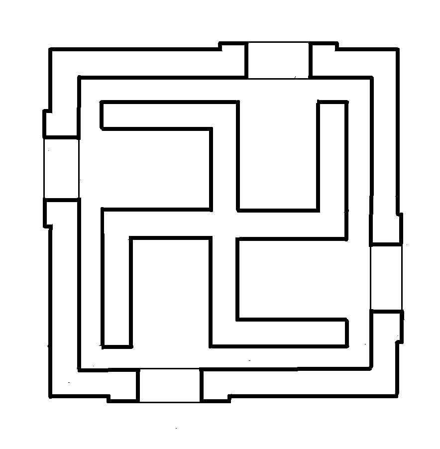 Frechen-Bachems grundplan – to skulpturer i én, et ydre kvadrat og en indre sauvastika