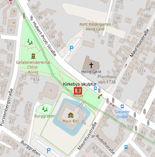 Haus Bitz står som bagtæppe for Frechen-Bachem, når man kommer ad Hubert-Prott Straβe og fra kirken. Og borgen føles også tilstede i værkets nære rum, selv om den ikke er en del af dette rum. Med nærheden forbinder værket sig til Haus Bitz konkret og med borgen som begreb.