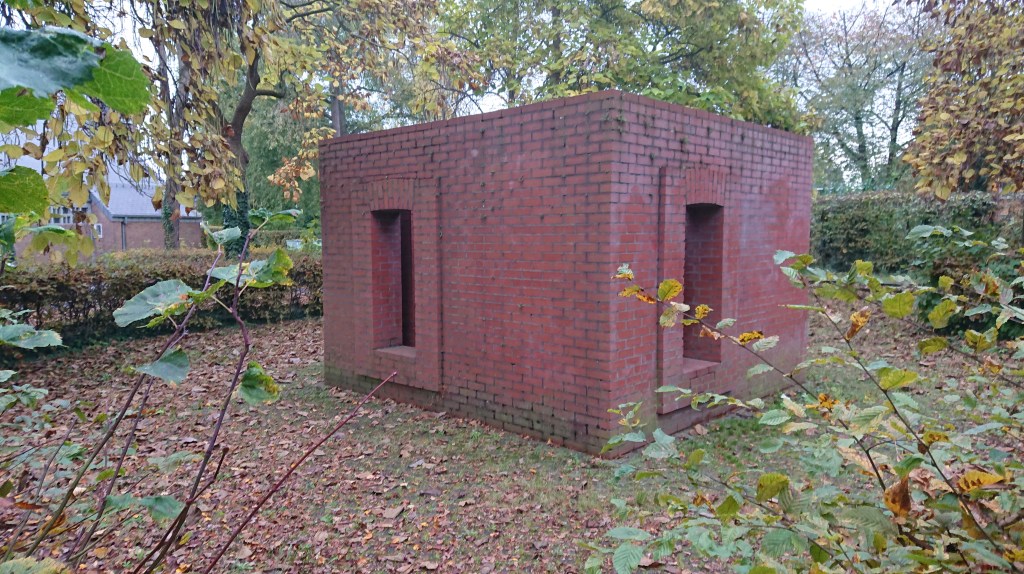 Frechen-Bachem’s outer walls are 3 metres high and 4.5 metres long. They are identical, with a wide, tall opening located to the left of the centre and wide, slightly protruding frames with a notch at the top. The sauvastika is the same height, it stands freely, but fills almost the entire interior space. The cross itself is only visible from a bird’s eye view.