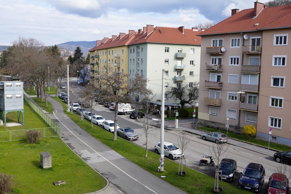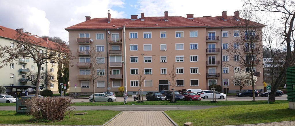 Boligblokkene i skulpturens rum er en del af et større område med etageboliger langs Körösistraβe og på stikveje fra vejen. Blokkene er fritliggende og fem etager høje, de har pudsede facader og er malet i forskellige farver. Det ser ud, som om at de har opholdsstuer mod vejen. Blokken overfor skolen, foto 4, har fuldt udsyn til Graz, mens ’sideblokkene’ kun har det delvist på grund af skolebygningens fløje og andre boligblokke.