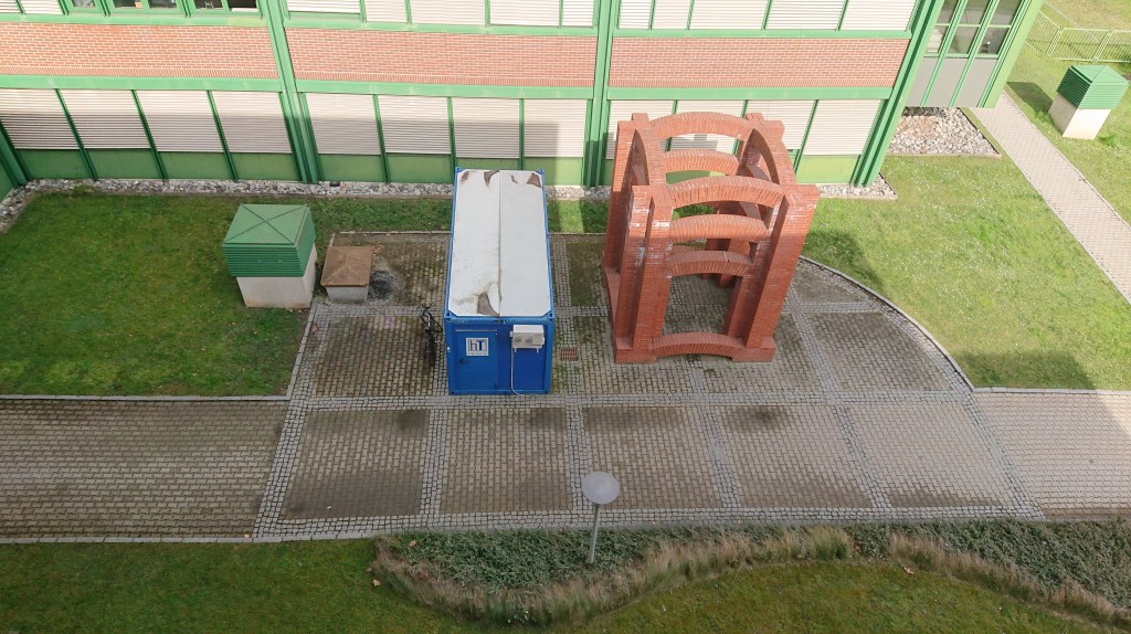 Graz er Østrigs næststørste by med omkring 270.000 indbyggere. Byen ligger i den sydøstlige del af Østrig i delstaten Steiermark. Kirkebys skulptur står ved en stor uddannelsesinstitution i Geisdorf, 1½ km fra centrum i den nordøstlige del af byen. Institutionen består af BRG Körösi, et såkaldt ’Realbundesgymnasium’ med hovedvægt på naturvidenskabelige linjer samt en slags teknisk skole, en HTBLVA Schule med byggeteknik og kunst og design som fagområde[1]. Graz står ved linjen for byggeteknik, der så vidt jeg kan læse mig til, tilbyder undervisning på forskellige niveauer, men ikke universitetsniveau. Kirkebys værk er placeret ved den nordlige del i en bred indgangsgård mellem to fløje med et indgangsparti inderst. Værket er trukket lidt ind i rummet op mod den ene side, se foto 1 og kortudsnittet.