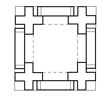 Den ydre grundplan er et kvadrat med en side på 3,7 m. Grundplanen er bygget op med græske kors i hjørnerne forbundet med buestik imellem. De græske kors har ’fødder’ på ydersider, men ikke på indersiden. De to ’fødder’ langs siderne danner vederlag for buestikkene, som forbinder korsene på ydersiden af armene. Værket har et meget enkelt udtryk, når man ser det på stedet, men den tegnede grundplan er ornamentagtig og finurlig. Den signalerer, at her er noget som skal stå solidt[3]. Med kvadratet som form står de fire sider og deres åbninger samtidig som ligestillede.
