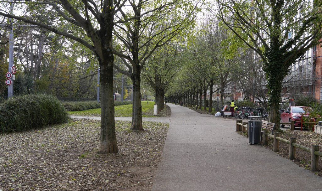 På stedet fornemmer man ikke skævheden i sidernes højde, og jeg oplever ikke rummet som en slugt. Det er, som om det grønne areals træer på 10-12 meters højde skaber en indre, fladere kasse, når man er her som gående eller cyklende. Og gaden er en anden verden. Rummet har et boulevardlignende, harmonisk udtryk, der dog udviskes delvist, når man er tættere på bygningerne på grund af deres store ensartede partier af glas. Museet skiller sig ud med sit palæudtryk. Det kan virke som et paradoks, at museet for nutidig kunst ligger i områdets ældste bygning. Og lidt klemt inde, som om at kunsten er oppe mod ydre, stærke kræfter. På anden side tænker jeg, at det står som billede på, at der også i 1920’erne har været nutidig kunst, og noget af det er ’blevet stående’ – som palæet. Og at det vil noget af den kunst, museet viser i dag sikkert ligeledes gøre.